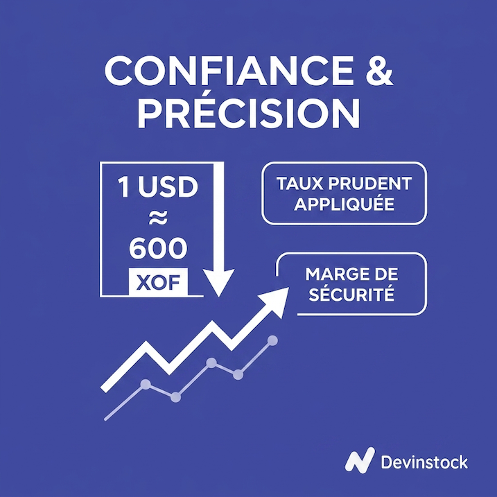 Etape 2: convertir vers XOF avec votre taux interne (pas seulement le spot)